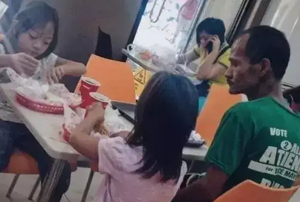 一位贫穷的父亲带着两个女儿去麦当劳的吃炸鸡。