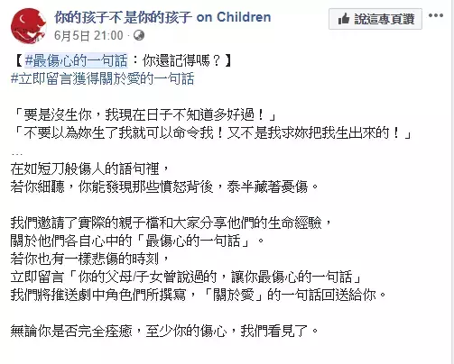 比如,《你的孩子不是你的孩子》剧组在脸书上发起活动:父母对你说的最伤心的一句话:你还记得吗?