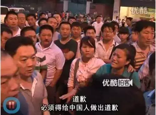 人群中有人高呼“敢在咱们的地盘打咱们中国人,把车给他掀了”,还有人凑在窗子上看到外国男子身上的沃尔玛标志,敲着窗子骂道“美国鬼子”。