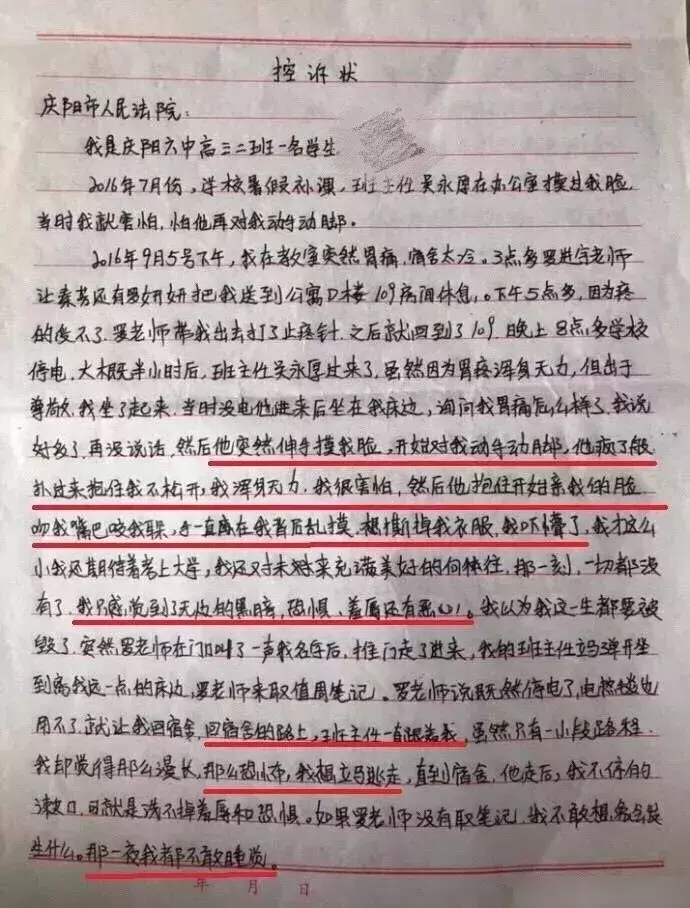 她只有19岁,原本是甘肃省庆阳六中的学生,却在读高三的时候被自己的老师吴某猥亵,虽然女孩对其进行了公开检举,但吴某却并没有受到法律的严厉制裁,反而招来学校的一片非议,这让女孩的心理遭受了极大的创伤,最终患上抑郁症,并出现多次自杀的倾向。