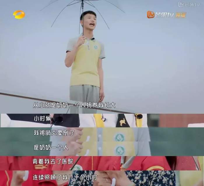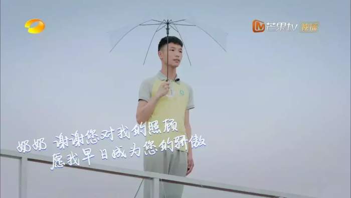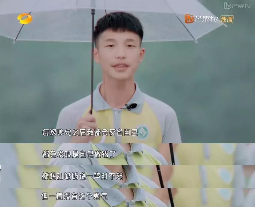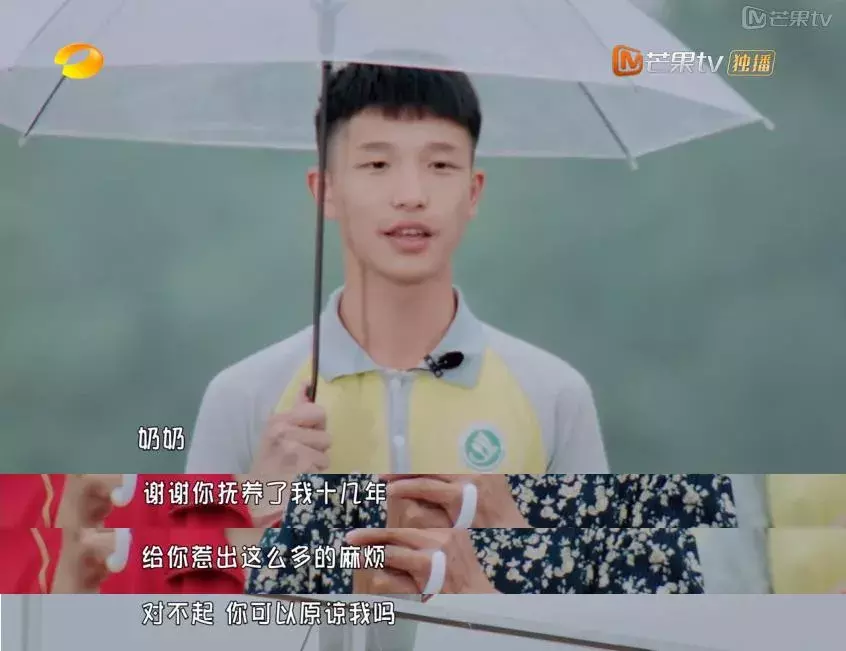 勇气台上,他撑着一把伞,深呼吸一口气后,终于喊出自己想说的话:“奶奶,谢谢你抚养了我十几年,这些年来给你惹出这么多的麻烦,对不起!”