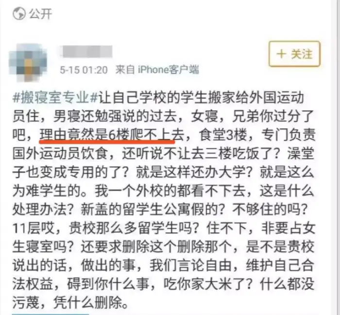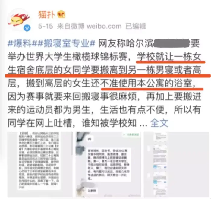 今年5月,就有学生爆料,哈尔滨某校为了举办大学生橄榄赛,让某栋楼的女同学集体搬宿舍,搬完宿舍后,还不准使用公寓的浴室。
