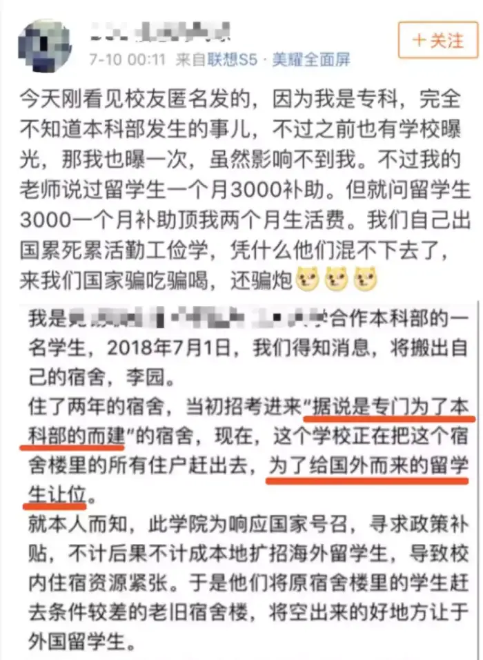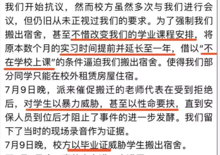 不少人感到愤怒,不仅仅是因为学校竟将好的宿舍给留学生。而是在学生们表露出不满的情绪后,校方竟要改变学生课业安排,以毕业证做威胁,用如此恶劣的态度,逼迫学生搬出去,甚至不惜以暴力威胁、性命要挟。