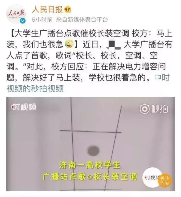 济南某大学的学生也是这么想的,生怕平日里的校长信箱是个摆设,于是,他们想了个新招:找广播台点歌。就这样,他们撺掇广播台的小伙伴,一起点了这么一首歌:“校长、校长、空调、空调~校长你什么时候装空调啊~”
