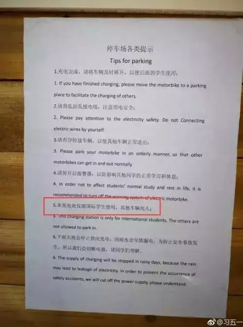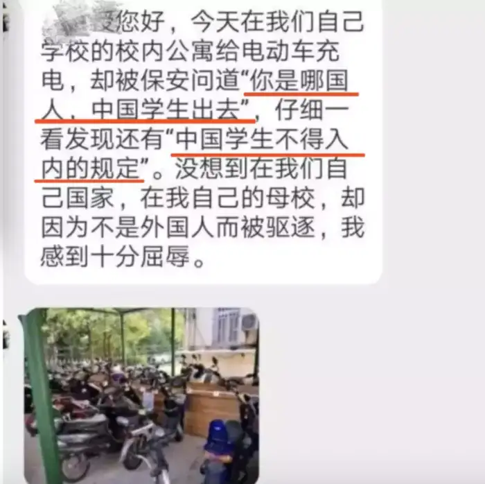 说到这里,不得不提到武汉某所大学了,为啥呢?因为有位学生,打算给电动车充电时,居然看到这样的规定——“中国学生不得入内”。
