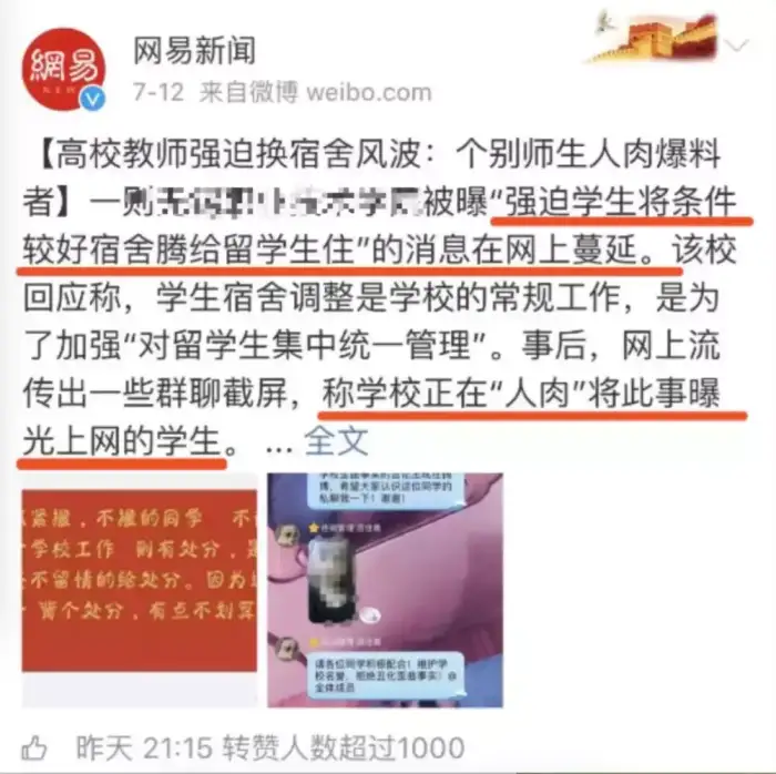 这两天,一则高校教师强迫学生,将条件好的宿舍腾给留学生住的新闻,闹得沸沸扬扬,引发了不少人的讨论和关注。
