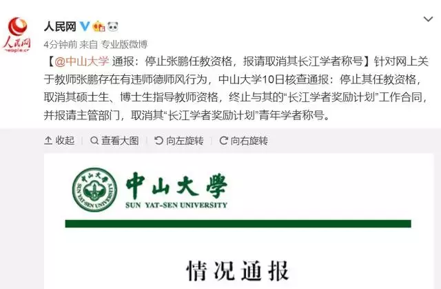 这则消息热传之后,中山大学迅速做出了反应,回应公众质疑,对涉事教师进行停课处理,申请主管部门取消张鹏的奖励计划。