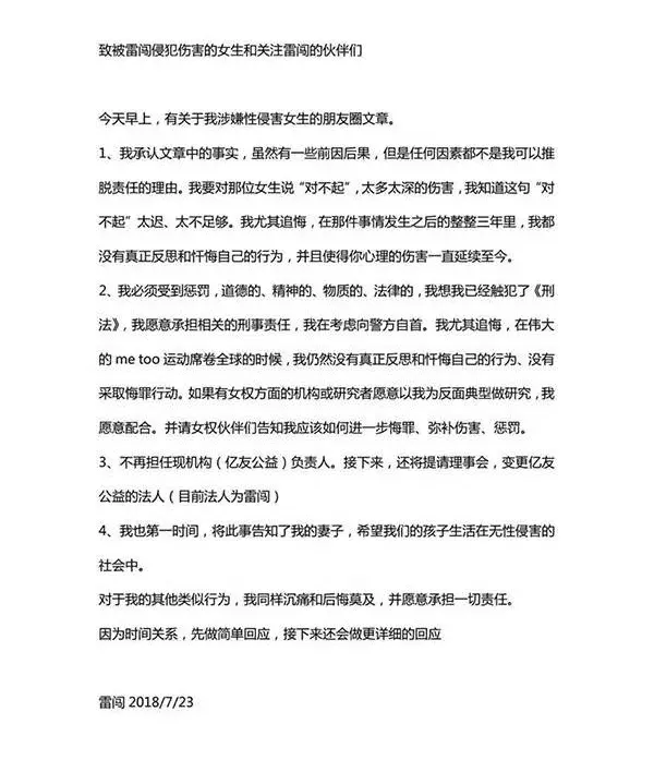 事情发生之后,雷闯先是承认了遥遥所说的事实,并予以道歉。