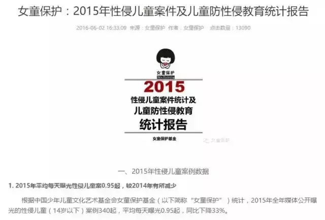中国少年儿童文化艺术基金会女童保护基金(以下简称“女童保护”)发布的数据显示,据不完全统计,2013年至2015年三年间,全国各地被媒体曝光的性侵儿童案共968起,受害儿童超过1790人。