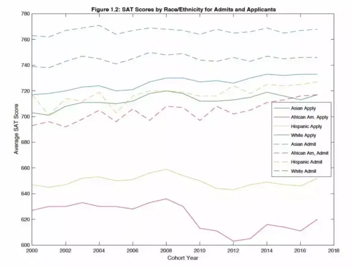 据SFFA的报告显示:整个亚裔申请人在许多客观条件方面比任何其他族裔群体都更强,包括SAT统考成绩,学业成绩和课外活动。