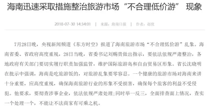 无独有偶,“免费港澳游”事件之后,最近又有新闻曝有旅行社推出只需50元的三天两晚“海南精品低价游”套餐。