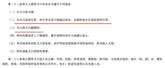 上海市甚至还专门规定了牵引带的长度,并规定大型犬只外出,需要佩戴嘴套,避免狗狗咬伤其他人或误食有毒食物。