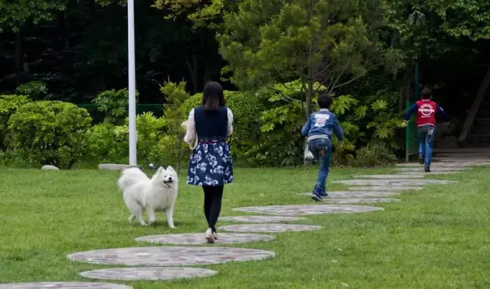 很多主人没有给宠物狗牵狗绳的习惯,让路人很没有安全感