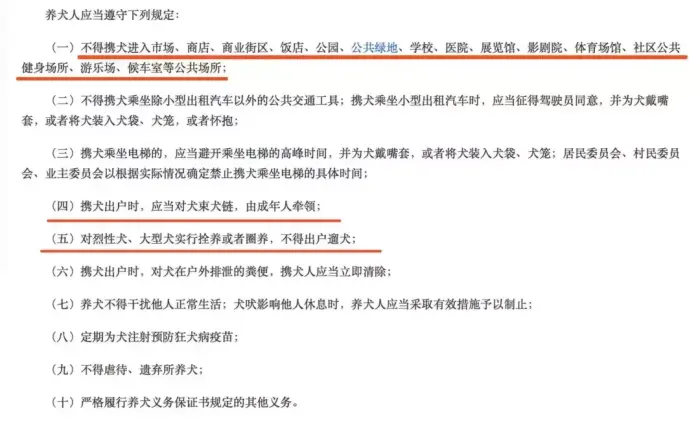 除此之外,条例还明确了养犬人应当遵守的其他几项规定,其中不仅对犬只进入的公共场所有了规定,还对乘坐交通工具、乘电梯以及宠物粪便有了限定。