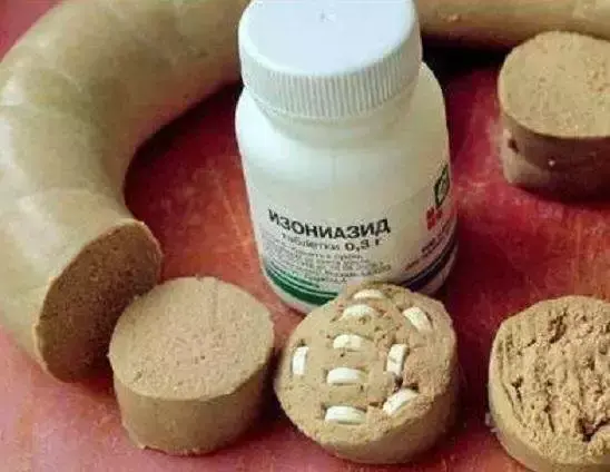 谁家狗要是对人有威胁,就将异烟肼药片塞到香肠里,只需要6片,大型犬都得毙命,而且因为不属于毒品,所以连警察也不会管。这不,怕大家看不懂,还专门配了张图片说明了下。