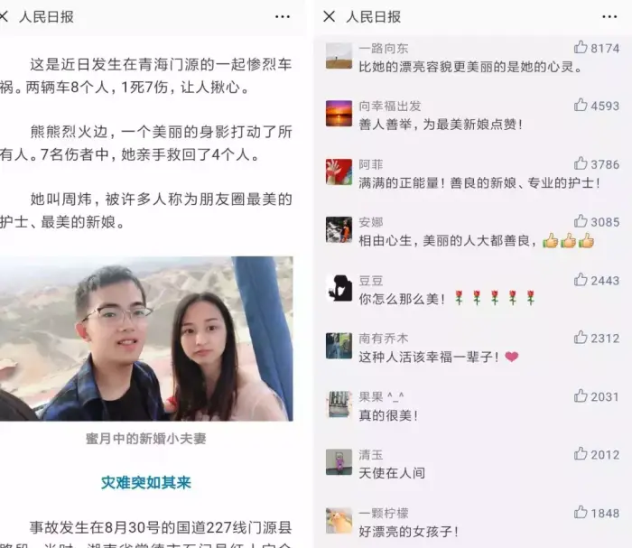 这两天,很多媒体都在报道一个“最美丽的新娘”。这个正在度蜜月的护士,在旅行途中遭遇一起车祸,她从起火的客车里抢出一个个乘客,又用自己的医护专业技能抢救伤员,亲手救下了4个人的生命。