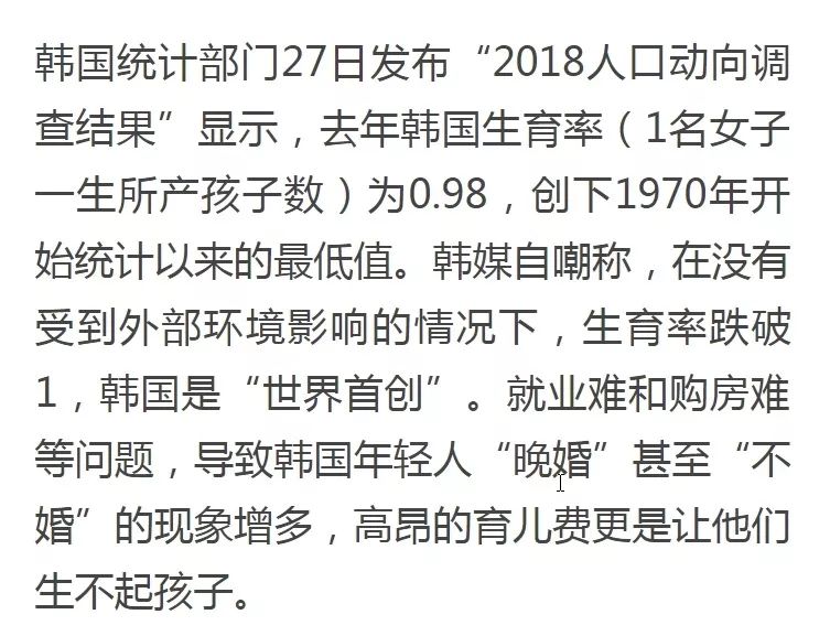 根据2018年出生统计,韩国生育率跌至0.98。这是韩国1970年代开始生育率统计以来的历史最低点,也是全世界最低。
