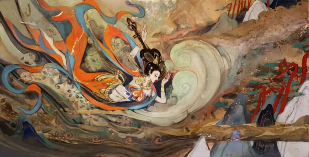 从这款飞天皮肤中,中国岩彩艺术研究者莲羊汲取灵感,以五彩的岩石研磨成粗细颗粒,调和成胶质绘制的岩彩画,历时半年绘制了《舞乐飞天》的岩彩画,具有很高的艺术价值。