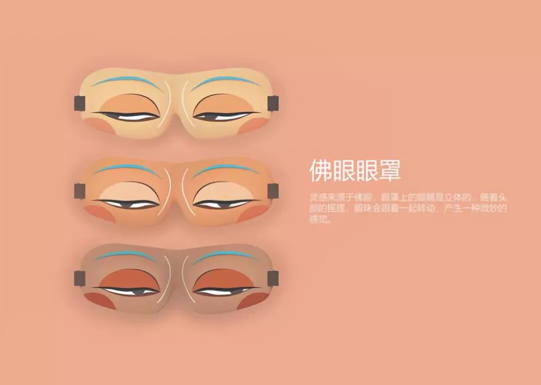 比如敦煌《观世音菩萨像》衍生佛眼眼罩。当作者在震撼于敦煌莫高窟的佛像,那一眼千年的慈悲,时间仿佛停驻于千年前某个匠人正在雕琢的一刻。那双眼睛,绝不是千年来享受朝拜的冰冷,而是在鼎盛的香火中有着眼波的流转,有着对善念的注目。