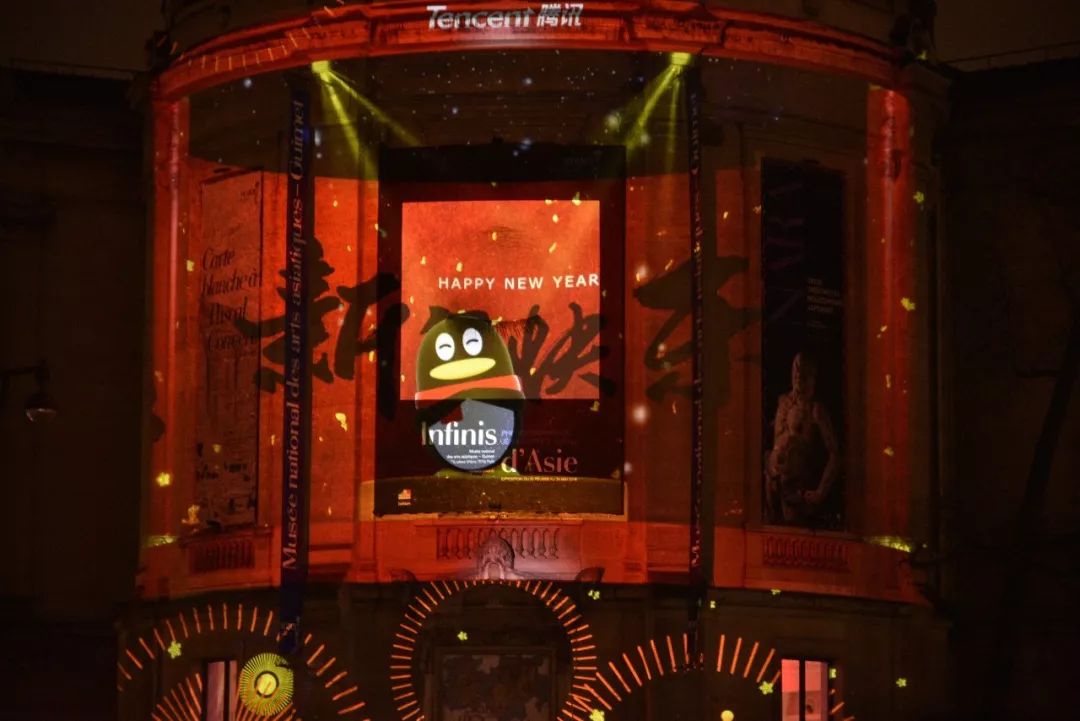 博物馆的墙体投影,将火红的鞭炮,灿烂的烟花,卖萌的狮子,还有微信红包,腾讯小企鹅……全都动态地呈现出来,变幻多姿,让人目不暇接。当传统的博物馆摇身一变“中国红”,火红,热烈,产生了有趣的3D魔幻效果。