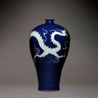元霁蓝釉白龙纹梅瓶,上绘白龙追逐火焰宝珠图案,栩栩如生,令人惊叹。