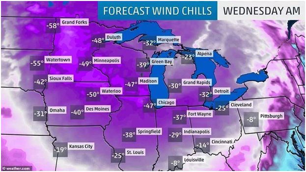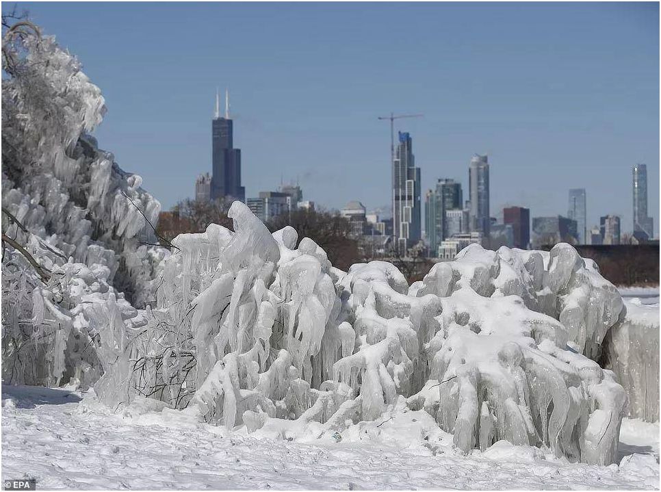 尤其是芝加哥的最低气温,甚至低于南极,创下了1966年以来的最低气温。