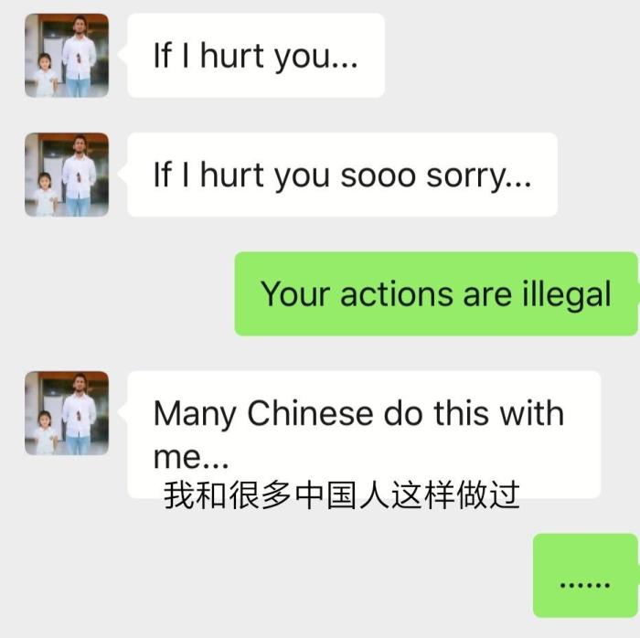 之后,民警根据女生的描述将犯罪嫌疑人带到派出所。该留学生来到派出所后,一直发微信请求女同学原谅他,并表示这样会毁掉自己的前程,试图用同情牌掩盖过去。但,被侵犯的同学没有同意,并提出走司法程序。接着,该留学生指导老师、国际合作与交流处和学校的相关领导相继赶到派出所处理事件。