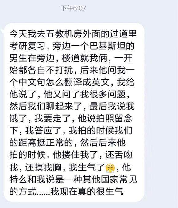 7月31日晚上,河北工程大学女同学在去五楼机房外面的过道里进行考研复习,旁边坐着一个外籍留学生。楼道里就他们两个人,本来互不打扰各自学习。之后留学生问该女生一个问题:如何把这句中文进行翻译。女生很礼貌地进行了解答,然后又回答了该留学生好几个问题。到了晚饭时间,女生便要离开吃饭。留学生提出想要合照一张,留作纪念。女生没有多想,便答应了。本来他们之间的拍照距离很正常,没想到拍的时候他一把搂住了女生,并开始猥亵。
