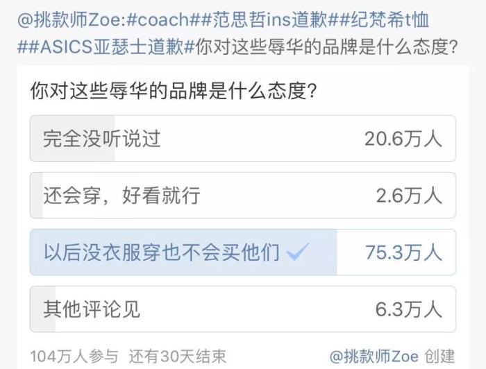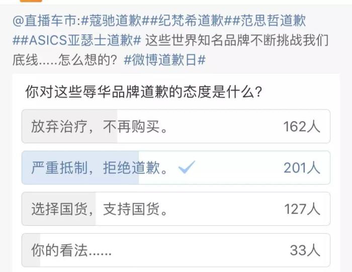 很遗憾,这次他们有点高估自己了。在微博有这么一个投票,有人问,你对这些辱华品牌道歉的态度是什么?投票最多的人选择: