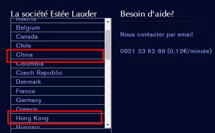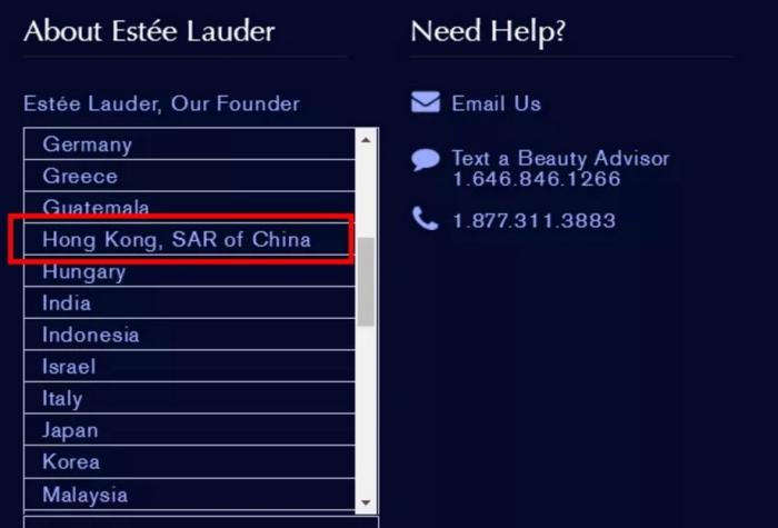如果说以上被曝出的品牌是装作“不懂”,那么雅诗兰黛这个品牌就是暗戳戳的小人行径。在其品牌的中国网站上,台湾、香港、澳门都是中国不可分割的一部分,而在国外网站就是不一样的位置了,而且在其台湾网站上甚至将中国都剔除了选项!