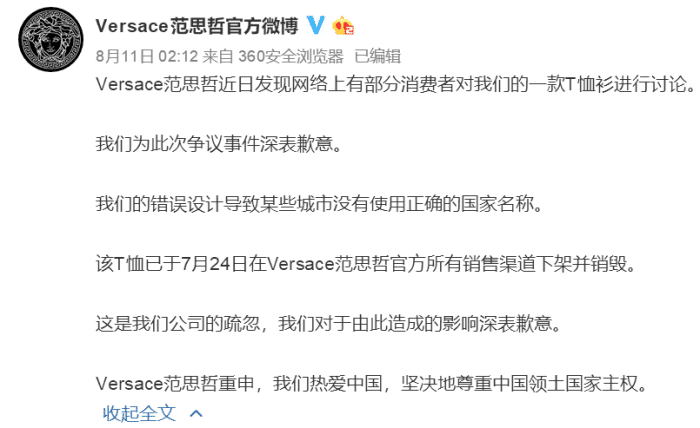 8月11日,“范思哲”迅速发布道歉声明。鉴于2018年的DG辱华事件中品牌的两面派做法,网友强烈要求品牌在国外媒体也做相应的道歉。