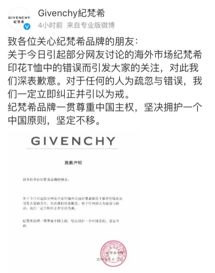 纪梵希方也发布声明,仅仅道歉就完了,而且需要说明的是,纪梵希的T恤是海外版,意味着他还想挣国外的钱,趁着这波热度。