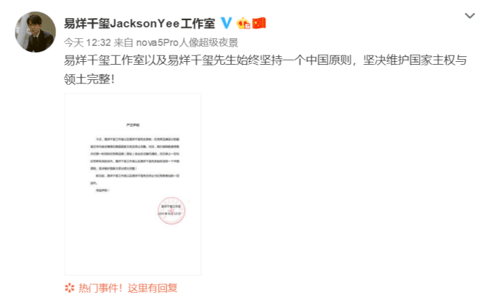 纪梵希的合作明星易烊千玺也发布声明,解除合作关系。