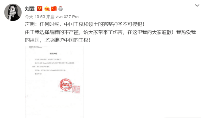 蔻驰的品牌合作明星刘雯,以一张律师函发布声明。