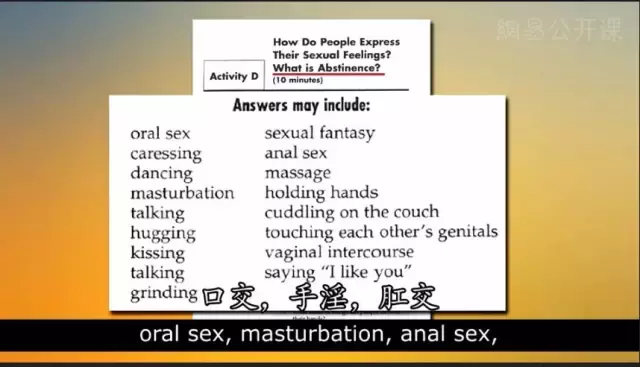 在计划生育联合会推出的《全面唯一》(It’s All One)教材中,极力推广性愉悦;为学生列出多种性行为的方式;列出表格让孩子们判断自己是否已经做好性行为的准备。