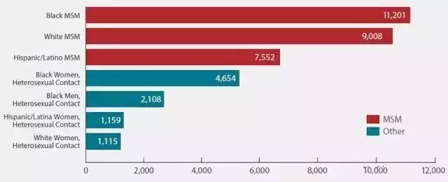 美国疾控中心2014年新诊断艾滋病案例比较图。红色部分分别为:黑人、白人和南美拉丁裔男男性行为者