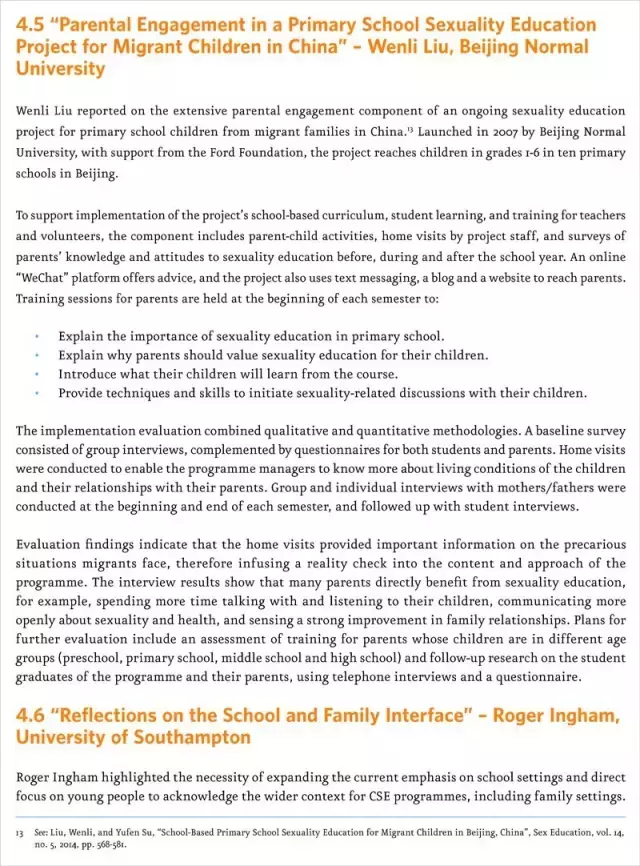 面对中国这样有自己传统、较为坚固的意识形态的大国,联合国不能像对待瑙鲁、尼日利亚那样简单、粗暴,但CSE也终于渗透进来。《珍爱生命——小学生性健康教育读本》的主编在美国期间,曾在计划生育联合会工作三年(实习教育工作者,2000—2003)。推广义工也在采访中说过,他们去美国的计划生育联合会参观、接受过培训。联合国人口基金2015年出版的CSE推广报告中,《珍爱生命——小学生性健康教育读本》在打工子弟学校的试验被列入第四章“实施评估”中的一节。