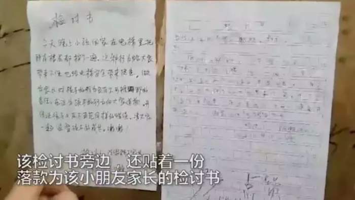 熊孩子做错事,家长在得知后,和孩子各写一份检讨书贴在电梯里
