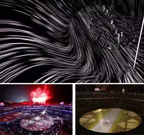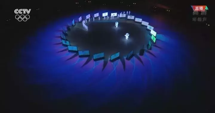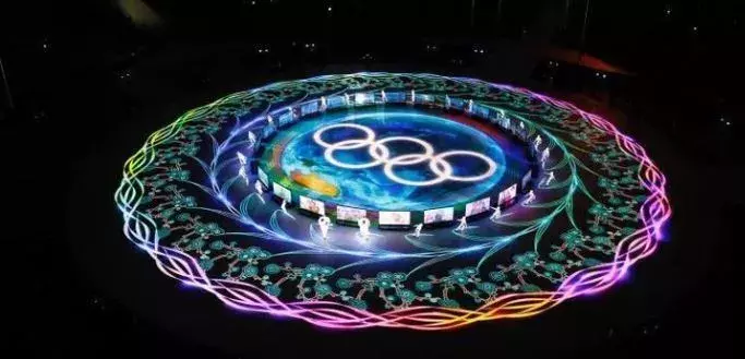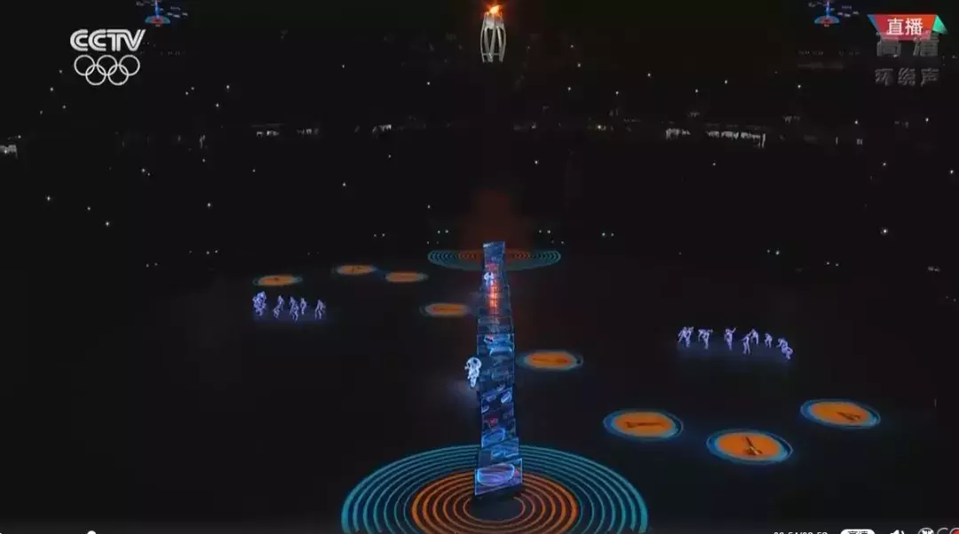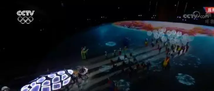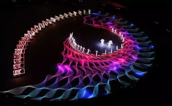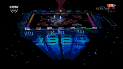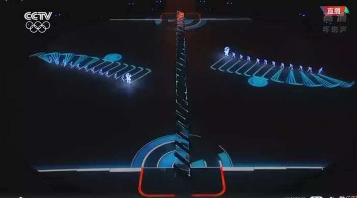 在开始时,用光影技术表现了冰雪比赛项目中的冰球和冰壶运动,让人耳目一新。