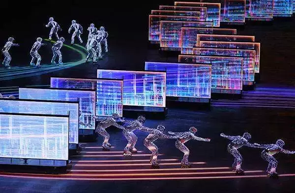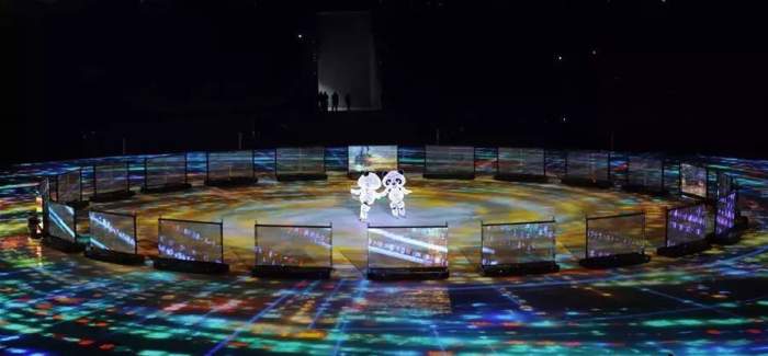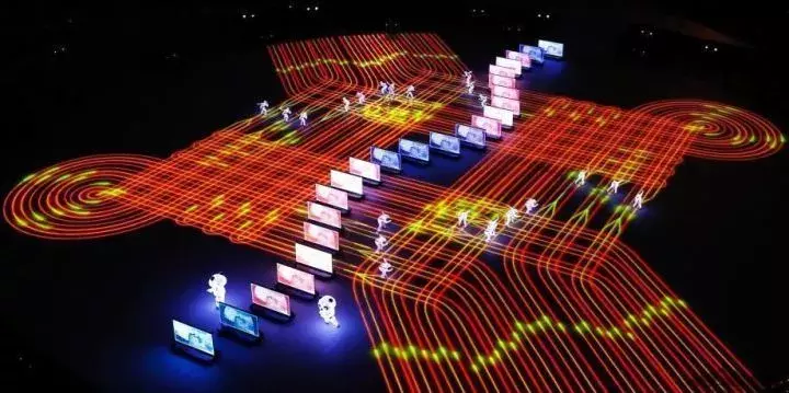 所以,有24个人工智能机器人与演员共同完成表演,机器人的画面出现了象征中国新时代科技与实力的高铁、桥梁、大飞机和天文望远镜等。
