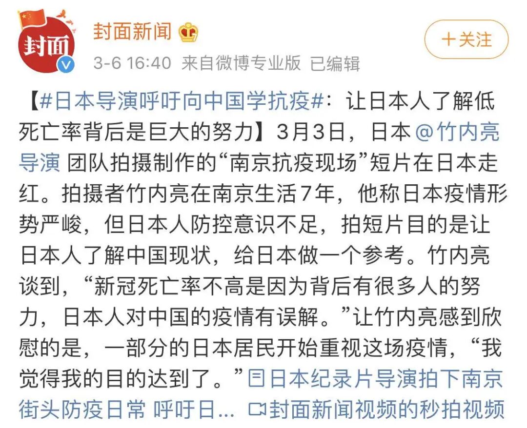 其实不光是日本人,多家美媒也开始分享中国防疫经验,国新办还专门召开新闻发布会,邀请了参与一线救治工作的专家,用英文向外国记者传授经验。