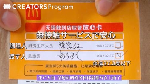 包装外还附带了一张放心卡,上面写着生产人员和呈递员的姓名和体温信息。
