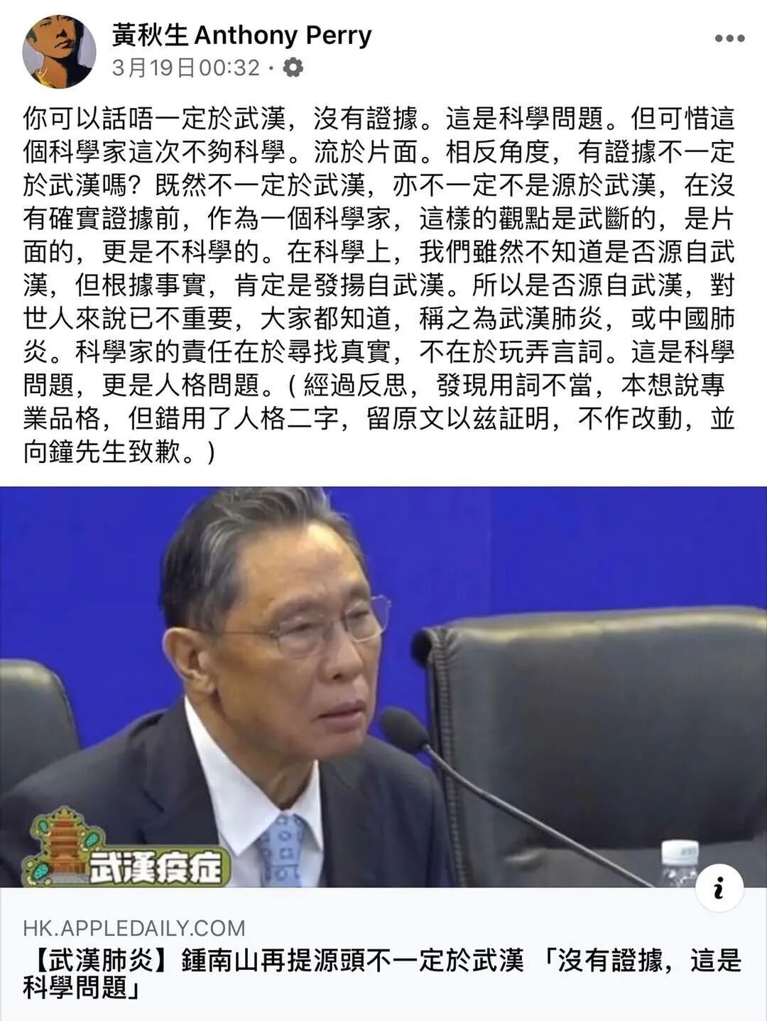他在社交媒体上公然诋毁钟南山:“科学家的责任在于寻找真实,不在于玩弄言词。”