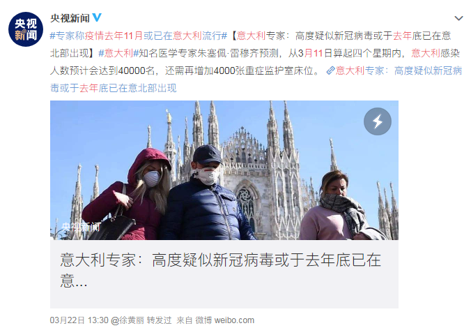 更令人震惊的是,意大利一位名叫雷穆齐的医学专家透露,这种病毒早在11月就在意大利开始传播。
