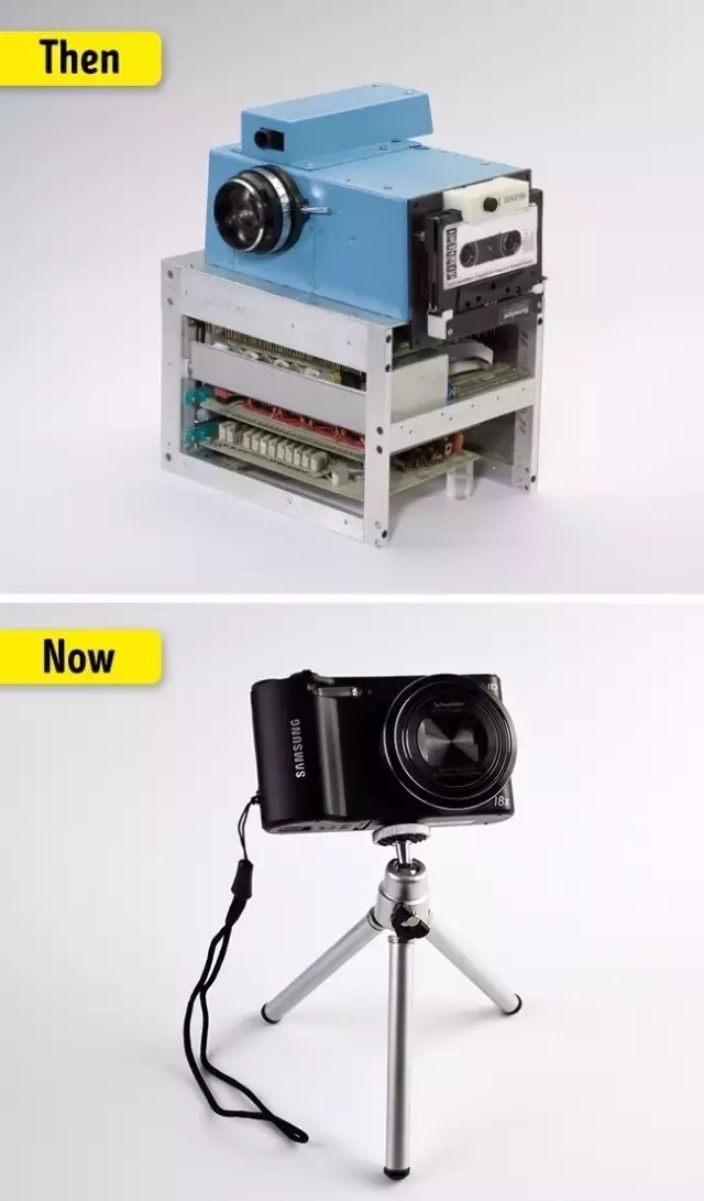 但在1975年(柯达开发了世界第一部数码相机),你必须抱着一只重达3.9 公斤,装有盒式磁带的家伙自拍。。顺便说一下,每盒磁带只能存储30张照片,配有16节电池!