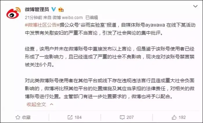 好在,新浪及时出手把Ayawawa禁言半年,让她没法再惑众。