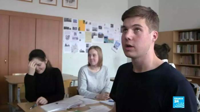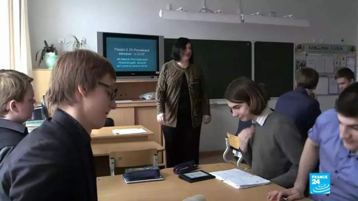 在这堂历史课上,历史教师奥尔加·乌科洛娃请学生们谈谈对十月革命的看法。这一章的题目为:“第3章,从俄罗斯帝国到苏联——伟大的俄国革命:历史道路的选择”。