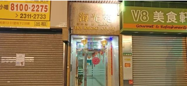 ● 李菁去世时的住址,港岛鲗鱼涌海光街海光苑,夹杂在快餐店间的一个小单位。