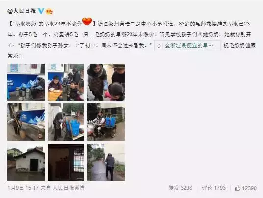浙江衢江区黄坛口乡80多岁的毛师花奶奶坚持在小学门口卖热早点,粽子五毛一个、鸡蛋饼五毛一个、豆浆五毛一袋,20多年不涨价,被称为“爱心早餐”。当年吃着她的早餐的孩子已经又送儿子来上小学了,毛奶奶还是一如既往地每天起五更、睡半夜地摆摊位孩子们提供早餐。