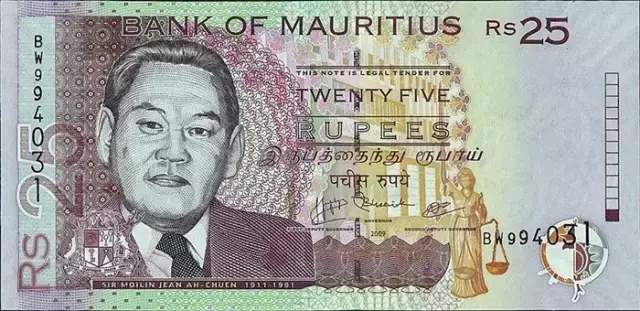 朱梅麟在毛里求斯25卢比上的画像(来源:ebay.com)